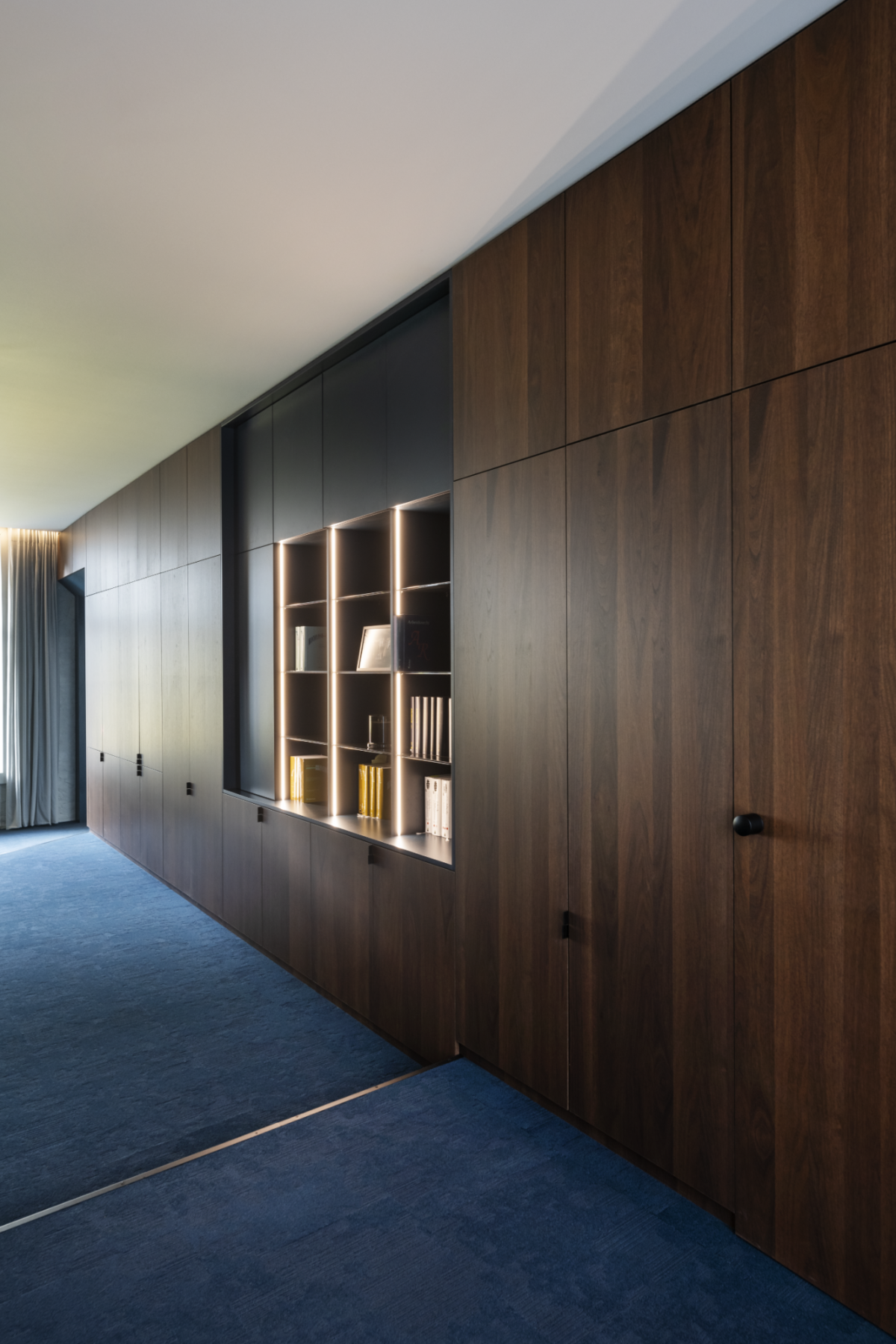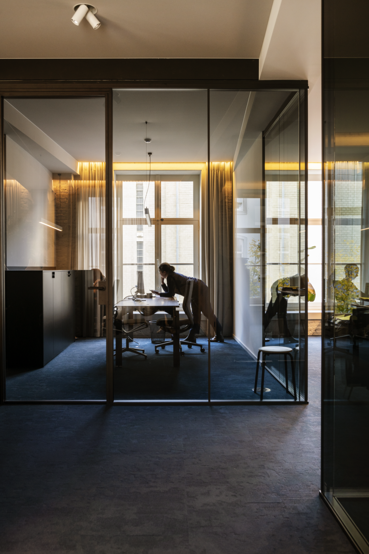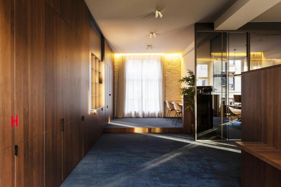 Op vier maanden tijd ontpopte een historisch pand zich tot sfeervolle kantoren voor Kwint Advocaten. De combinatie van blauw, walnoot en gerookt glas vormt een tijdloze en stijlvolle basis voor de kantoren. ism PJ Mares.
